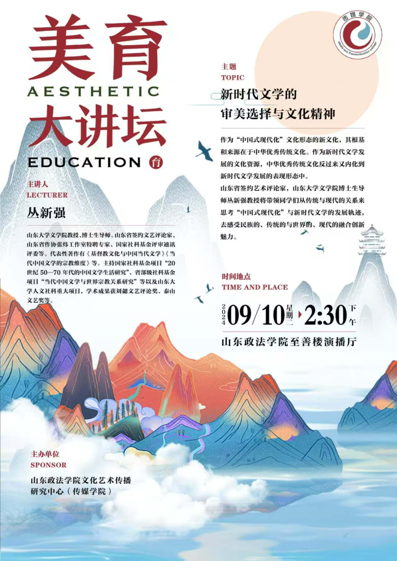 大通社讯(记者 王存浩 牛济霖)9月10日下午,山东大学文学院博士生导师丛新强教授以《新时代文学的审美选择与文化精神》为题做客山东政法学院美育大讲坛,山东政法学院传媒学院院长孟文彬主持讲座。