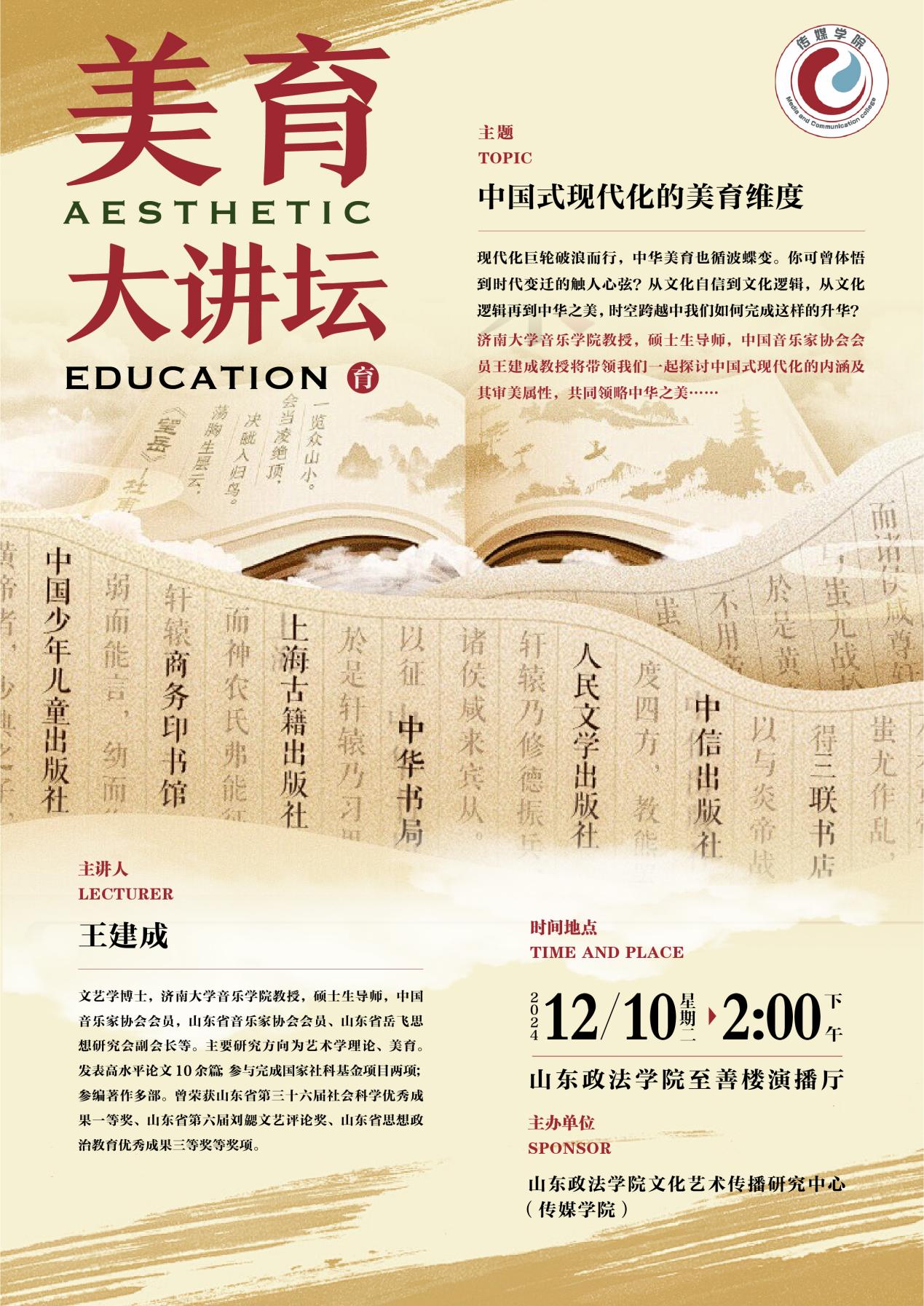 大通讯社(记者王佳贺 王天民)12月10日下午,济南大学王建成教授以《中国式现代化的美育维度》为题做客山东政法学院美育大讲坛,山东政法学院传媒学院院长孟文彬主持本期讲座。