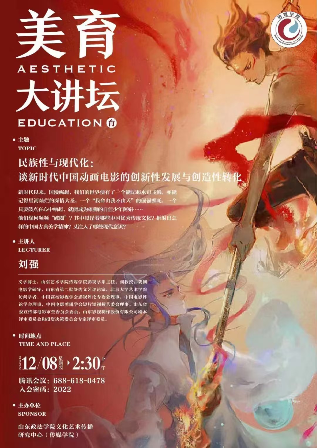 大通社讯(记者禚然飞 徐旺)12月8日下午,山东签约文艺评论家刘强以“民族性与现代化:谈新时代中国动画电影的创新性发展与创造性转化”为题做客山东政法学院美育大讲坛第29期,山东政法学院传媒学院(文化艺术传播研究中心)张晶晶教授主持讲座。