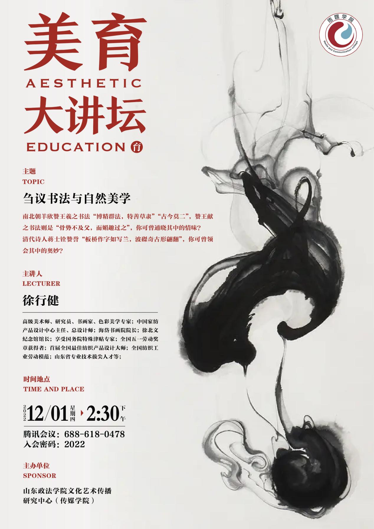 大通社讯(记者 赵乐 陈奕娇) 12月1日下午,海岱书画院院长、徐北文纪念馆馆长、高级美术师徐行健先生以“刍议书法与自然美学”为题做客山东政法学院美育大讲坛第27期,山东政法学院传媒学院(文化艺术传播研究中心)教师龚天雁博士主持讲座。