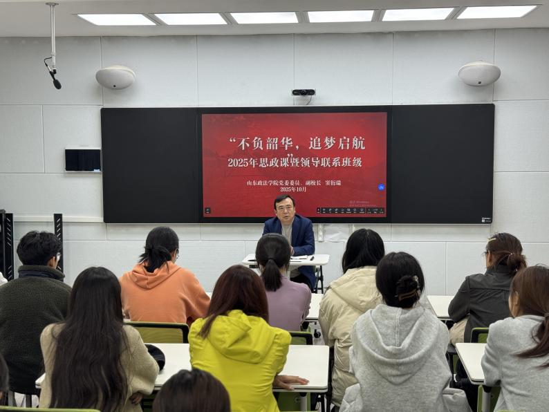 2025年10月28日,山东政法学院党委委员、副院长窦衍瑞走进传媒学院,与2025级新闻学1班开展“领导联系班级”座谈交流并讲思政课。