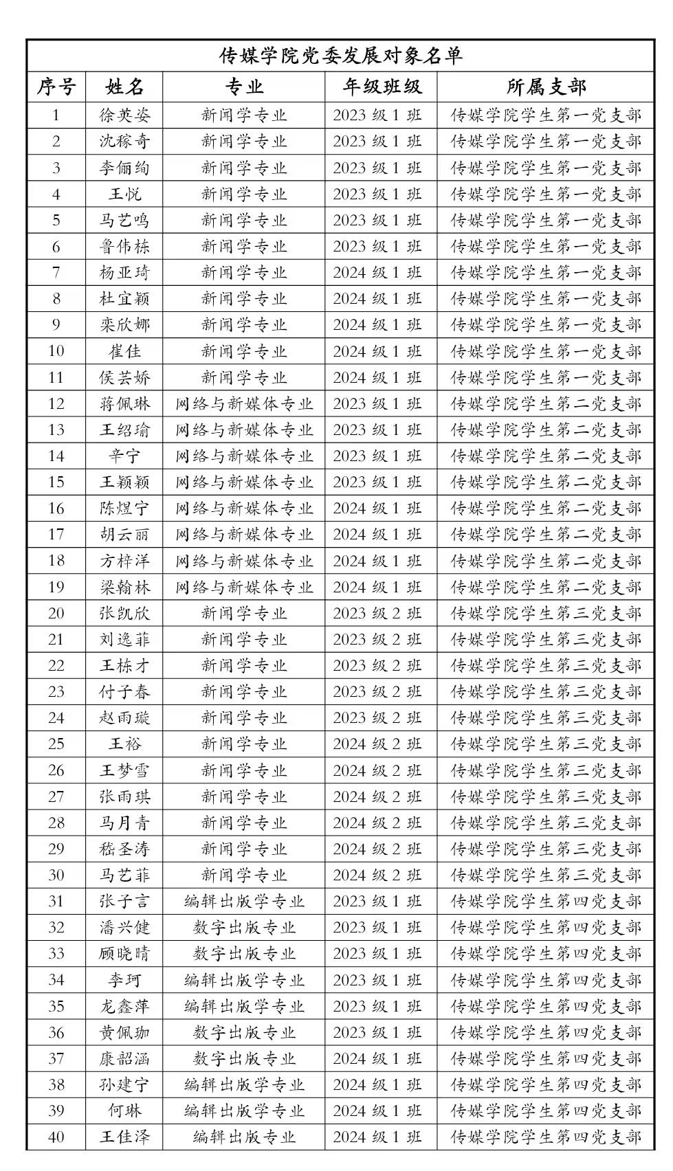 经支部委员会研究,报传媒学院党委备案同意,将徐英姿等40名同志列为发展对象。根据发展党员工作有关要求,为增强发展党员工作的透明度,接受党内外群众的监督,确保发展党员的质量,现将发展对象的基本情况公示如下(名单附后):