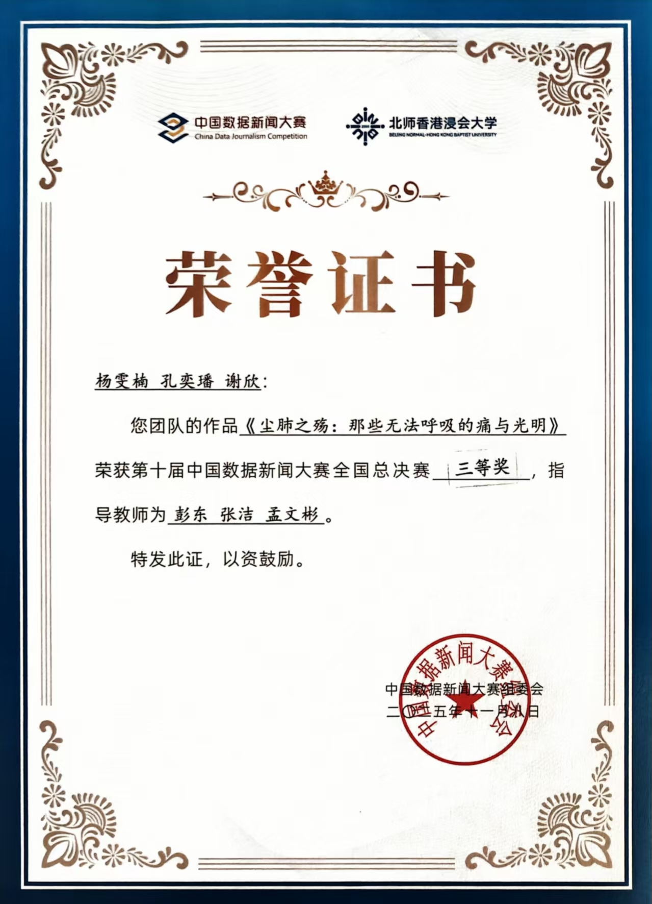 近日,第十届中国数据新闻大赛暨首届AIGC应用大赛决赛在珠海北师香港浸会大学圆满落幕。山东政法学院传媒学院派出两支代表队表现优异,斩获全国三等奖和优秀奖各一项,展现了山政学子扎实的专业素养与创新实践能力。