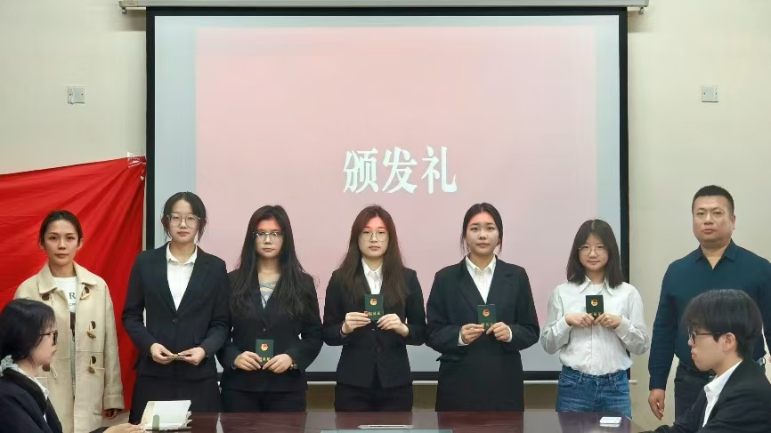 入团仪式在庄严的国歌声中拉开帷幕。全体参与人员肃立齐唱国歌,现场气氛庄重而热烈。在宣读2025年度新发展团员名单后,刘涛、刘晓萌为新团员代表佩戴团徽徽章、颁发团员证,并向新团员致以诚挚祝贺。