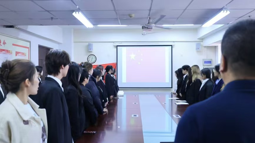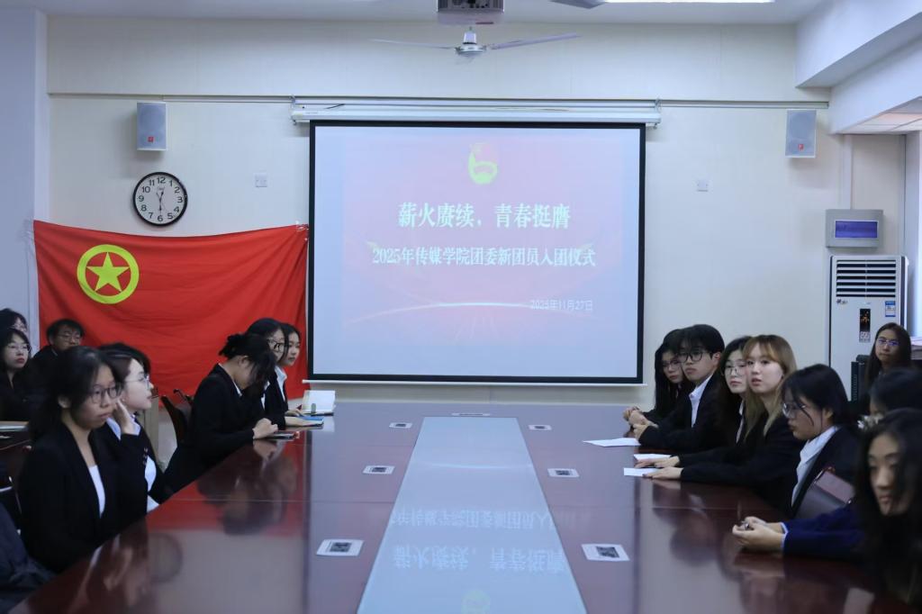 (记者 张子琪)为进一步加强我院共青团组织建设,切实提高团组织的凝聚力与向心力,引领广大青年学子坚定政治立场,强化责任担当。11月27日,传媒学院举行“薪火赓续,青春挺膺”——2025年新发展团员入团仪式。学院党委副书记刘涛、团委副书记刘晓萌、优秀团员代表、2025年新发展团员参与仪式。团委学生副书记王存浩主持会议。