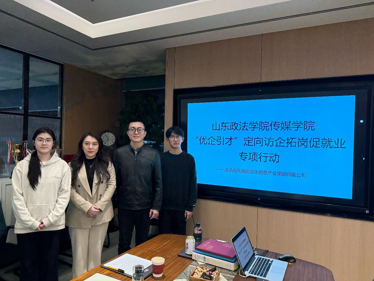 为深入贯彻落实山东省“优企引才”定向访企拓岗促就业专项行动要求,深化校企协同育人机制,精准对接行业数字化转型需求,1月29日下午,传媒学院视听传播教研室主任郭潇雨及学生代表赴山东泉韵文化创意产业集团有限公司开展访企拓岗交流,公司副总经理杜春热情接待并参加座谈。